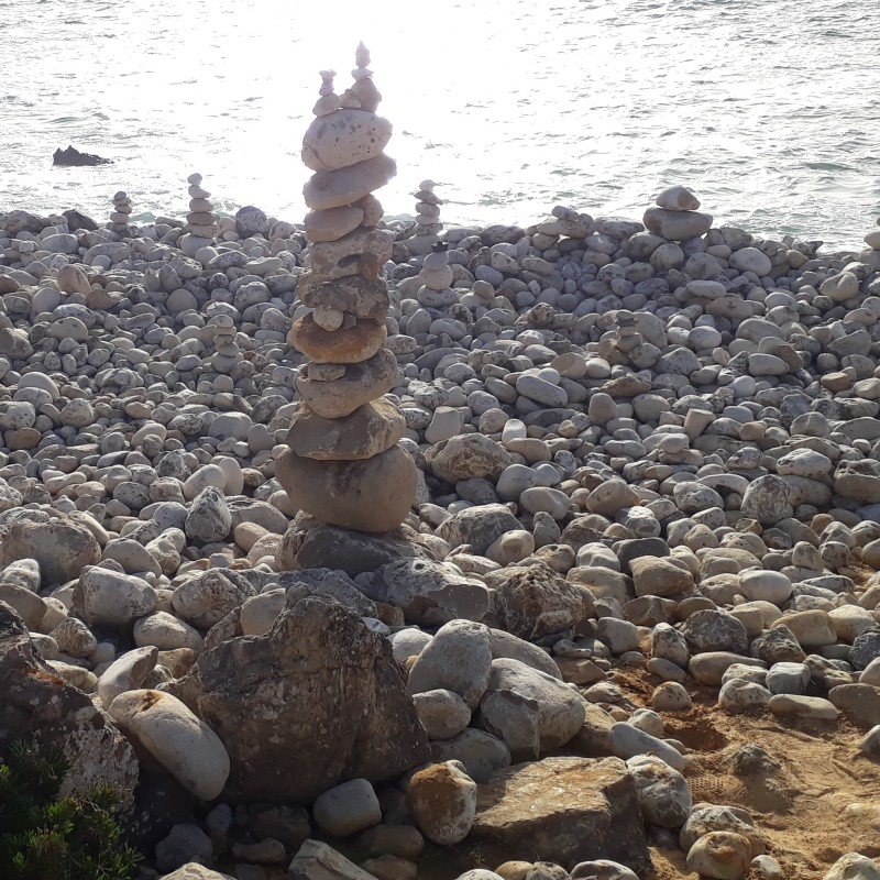 Um trecho de uma praia, quase inteiramente coberto por pedras arredondadas no chão. Há uma torre de pedras empilhadas (próximo ao centro da imagem), com cerca de um metro de altura, formada por cerca de 20 pedras de tamanhos diferentes. Alguns metros atrás, há outras três torres bem menores, formadas por cinco ou seis pequenas pedras. A luz do sol é refletida intensamente na água do mar.